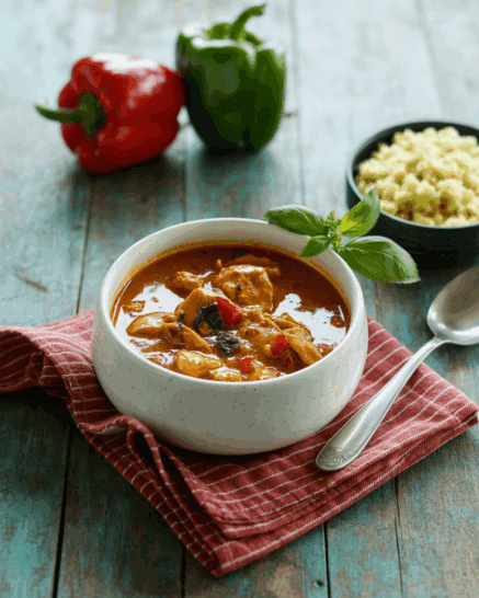A flavorful twist on a classic red curry stew, this keto-friendly version swaps rice for cauliflower, perfect for a cozy night in.