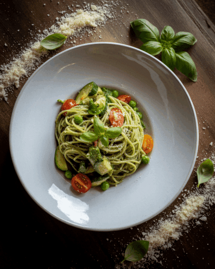 Enjoy a symphony of flavors with fresh veggies, al dente pasta, and basil-infused pesto in this delightful springtime recipe.
